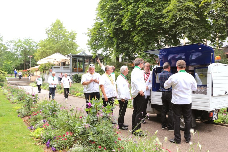 Was für ein Empfang: Kochbrüder, Gäste, Sponsoren und auch Schwägerinnen treten ein in ein wahrhaft kaiserliches Geschehen: Mittelalterliche Rundzelte, bewaffnete Ritter, die Kulisse im Park und auf der Freitreppe zu Schloss Herrnsheim einfach großartig – Mittelaltermarkt – ein einmaliges Erlebnis. Das Fanfarencorps der Nibelungenstadt Worms, perfekt, unterhält uns mit einem Standkonzert. Ein Bier- und ein Weinstand löschen den Durst.